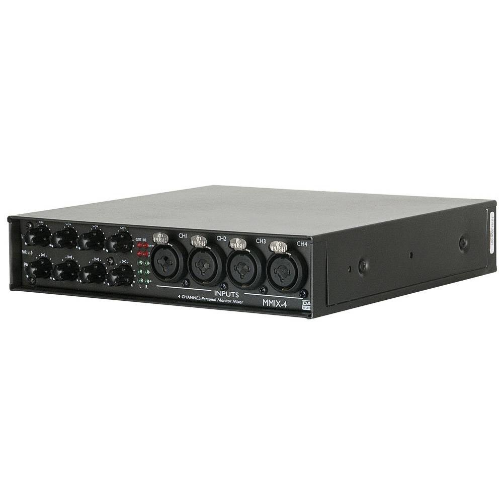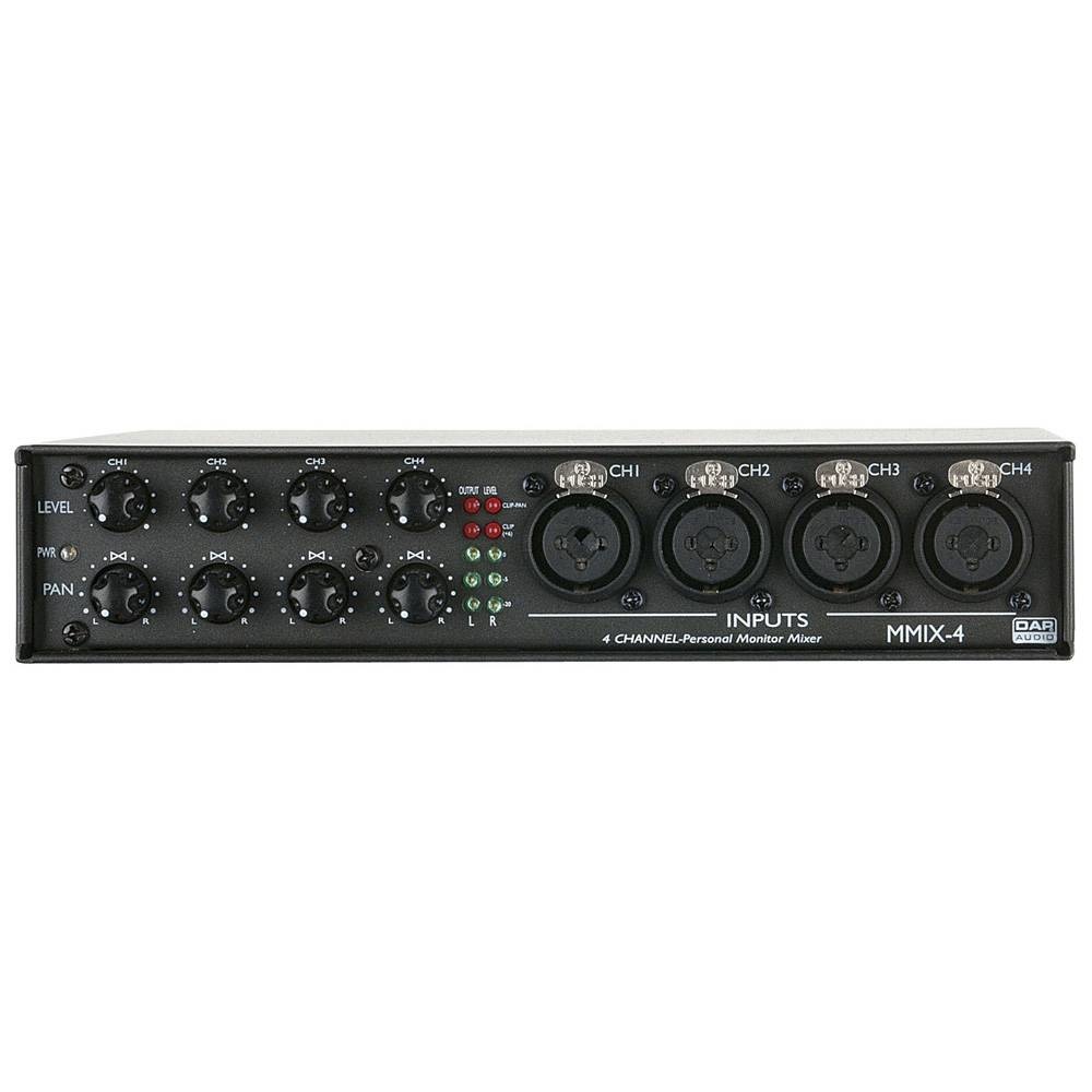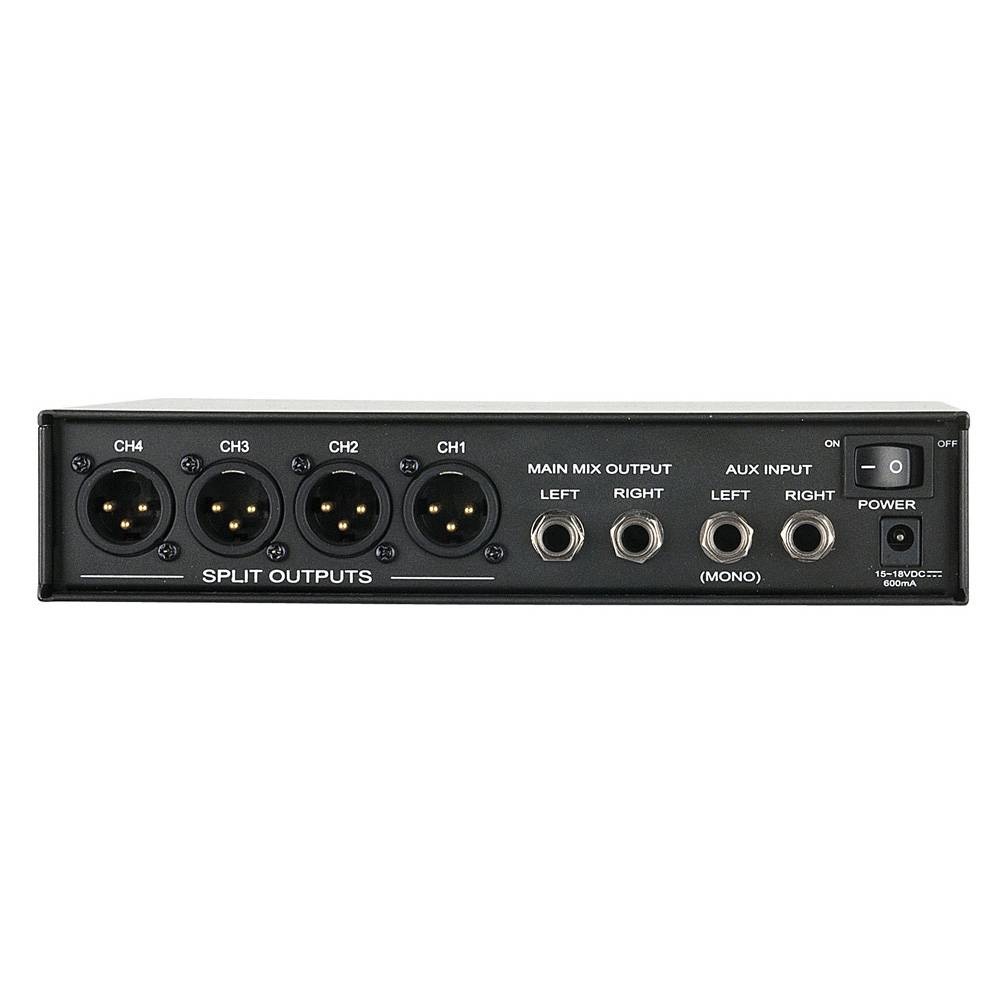 Aan de achterzijde zitten 4 XLR uitgangen, een main uitgang (uitgevoerd als jack) en nog een aux ingang. Het is een ideaal systeem om bijvoorbeeld het volume van diverse in-ears te regelen.